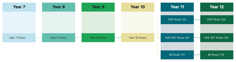 Through continuous and sequential music learning, students listen to, compose and perform with increasing depth and complexity. Through performing, composing and listening with intent to music, students have access to knowledge, skills and understanding which can be gained in no other way.